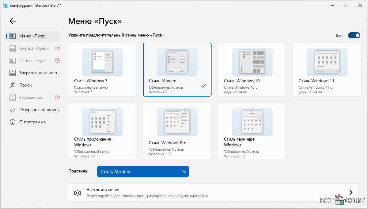 Невероятно полезный инструмент Stardock Start11 v2 для изменения стандартного интерфейса Windows 11. Программа поможет изменить внешний вид кнопки Пуск, меню и панели задач, в комплекте выбор из более 10 готовых дизайнерских шаблонов оформления на выбор, их можно настраивать по своему вкусу, менять цвет или расположение.