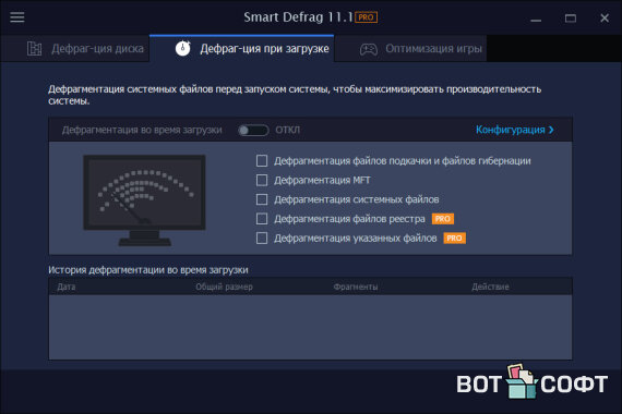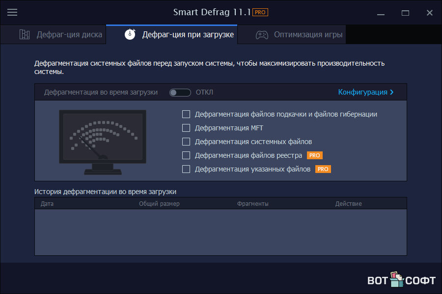 Интерфейс у Smart Defrag Pro на русском, так что разберется любой, даже если с компами не очень дружит. Все функции безопасные и понятные. Кроме того, в программе есть возможность сделать кучу дополнительных оптимизаций для твоей системы, но это только в Pro версии (ключ активации в комплекте, как положено).